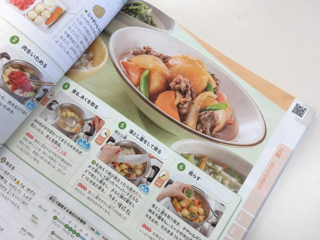 この学習では、野菜の皮むきや切り方といった「下ごしらえ」から、火加減や調味など「煮る」調理の基礎・基本を習得します。