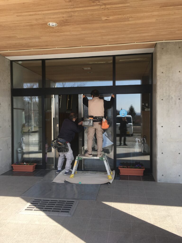 先日、張り替えたペアガラスに飛散防止のフィルムを貼ったり…(業者の方が)